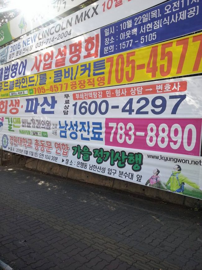 2015.10.13 글쓴이 박선이 사무간사 10월 현수막 게시 현황입니다. 9월과 마찬가지로 등반행사 관련 플래카드 게시했습니다 게시 일정과 장소는 10월6알 ~ 12일까지 신흥주공 옆 삼거리 우측, 13일~19일까지 산성역 서리 우측 (인공폭포 앞) 입니다. 감사합니다.